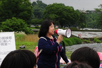 ![]() 最初は植物観察の山ちゃんからの感想。 子ども達、みんな楽しかった? は〜い。 | ![]() 次は植物観察の松井さんの感想。 植物って面白いでしょ。河辺の植物を楽しんでね。 |
