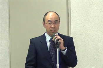 ![]() 司会を務めるのは青梅・多摩川水辺のフォーラム事務局の丸山。 | ![]() 山崎充哲氏による講演。 |