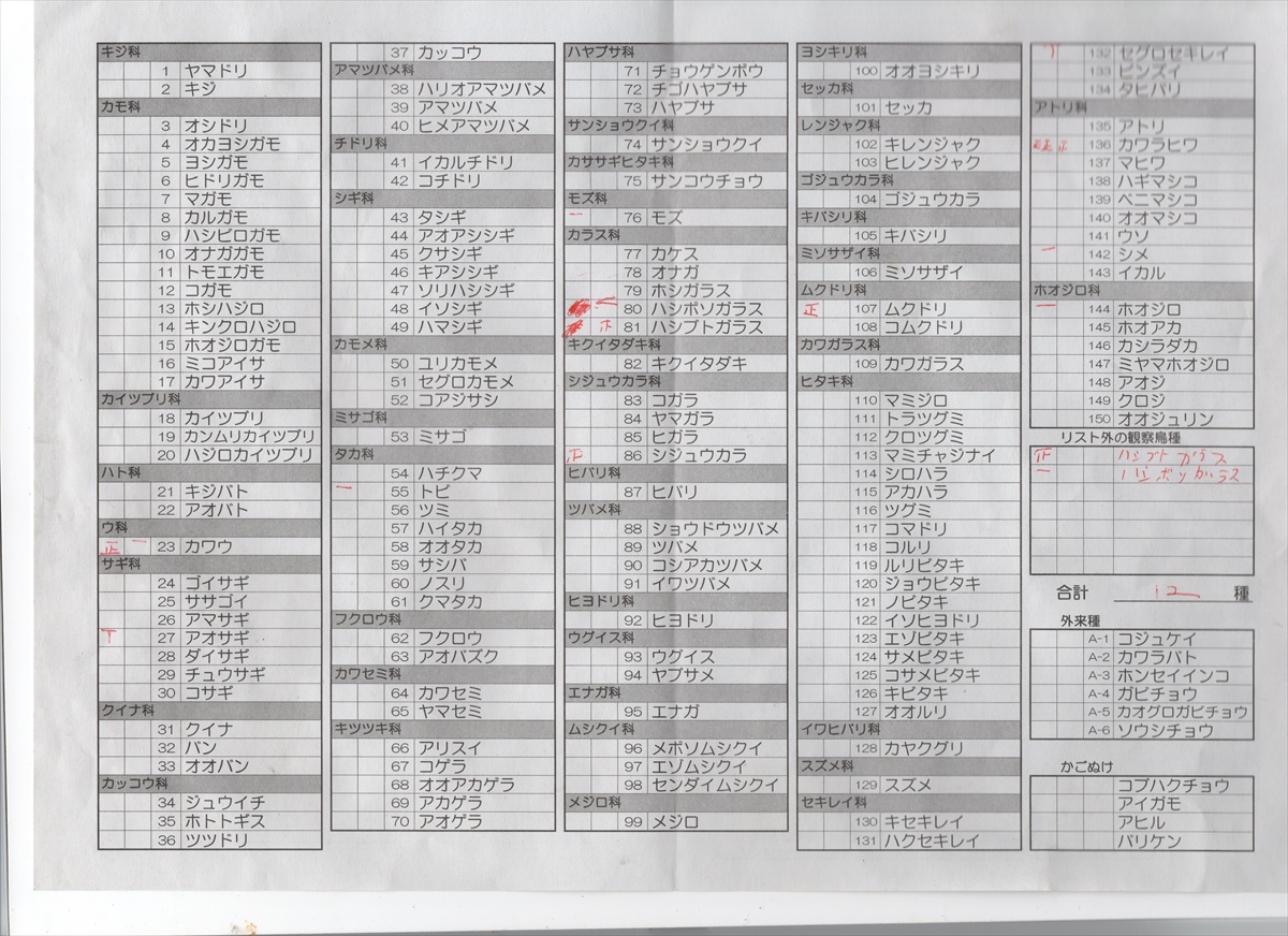 | 最後に野鳥観察で見えた/聞こえた鳥の名前です。約27種類いました。 野鳥の名前をクリックするとウィキペディアの野鳥の説明に飛びます。 カルガモ、ホオジロガモ、キジバト、コサギ、オオタカ、モズ、ウグイス(さえずりのみ)、エナガ、コジュケイ、ツグミ、ジョウビタキ、アオサギ、カワラヒワ、カワウ、コゲラ、シジュウカラ、シメ、スズメ、ハクセキレイ、セグロセキレイ、ダイサギ、トビ、ハシブトガラス、ハシボソガラス、ヒヨドリ、ホオジロ | |