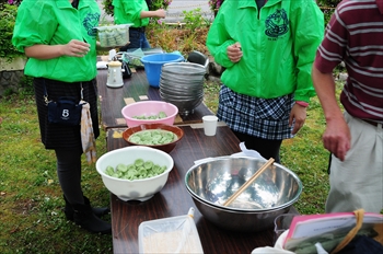 ![]() なかなか、美味しいね。 | ![]() のどに詰まりそう。向こうのテーブルも出来上がったものを並べています。 |