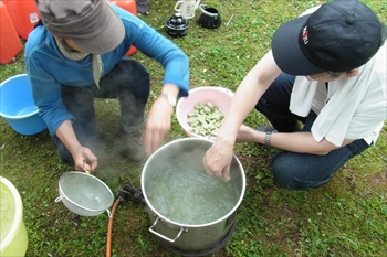 ![]() ゆでたあとザルに取り冷やします。 | ![]() これはソーラークッカー。カキドオシを煎じて香りのいいハーブティーができました。 |