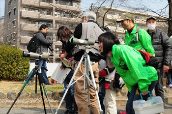 ![]() さっそく望遠鏡で野鳥を観察します | ![]() 向こうで飛んでいるのはトビかな・・・ |